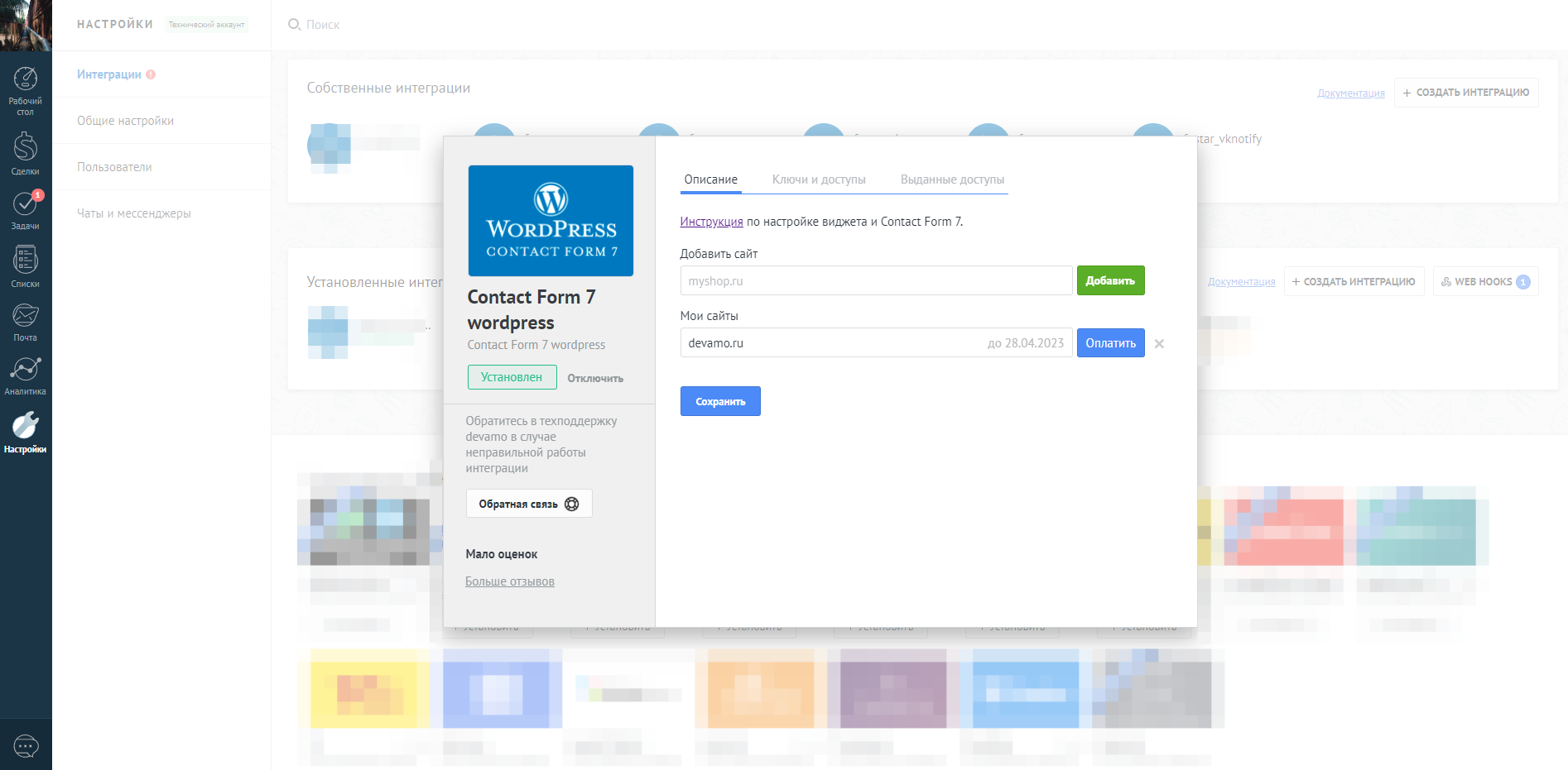 При первой установке интеграции автоматически предоставляется тестовый период сроком на 7 дней!