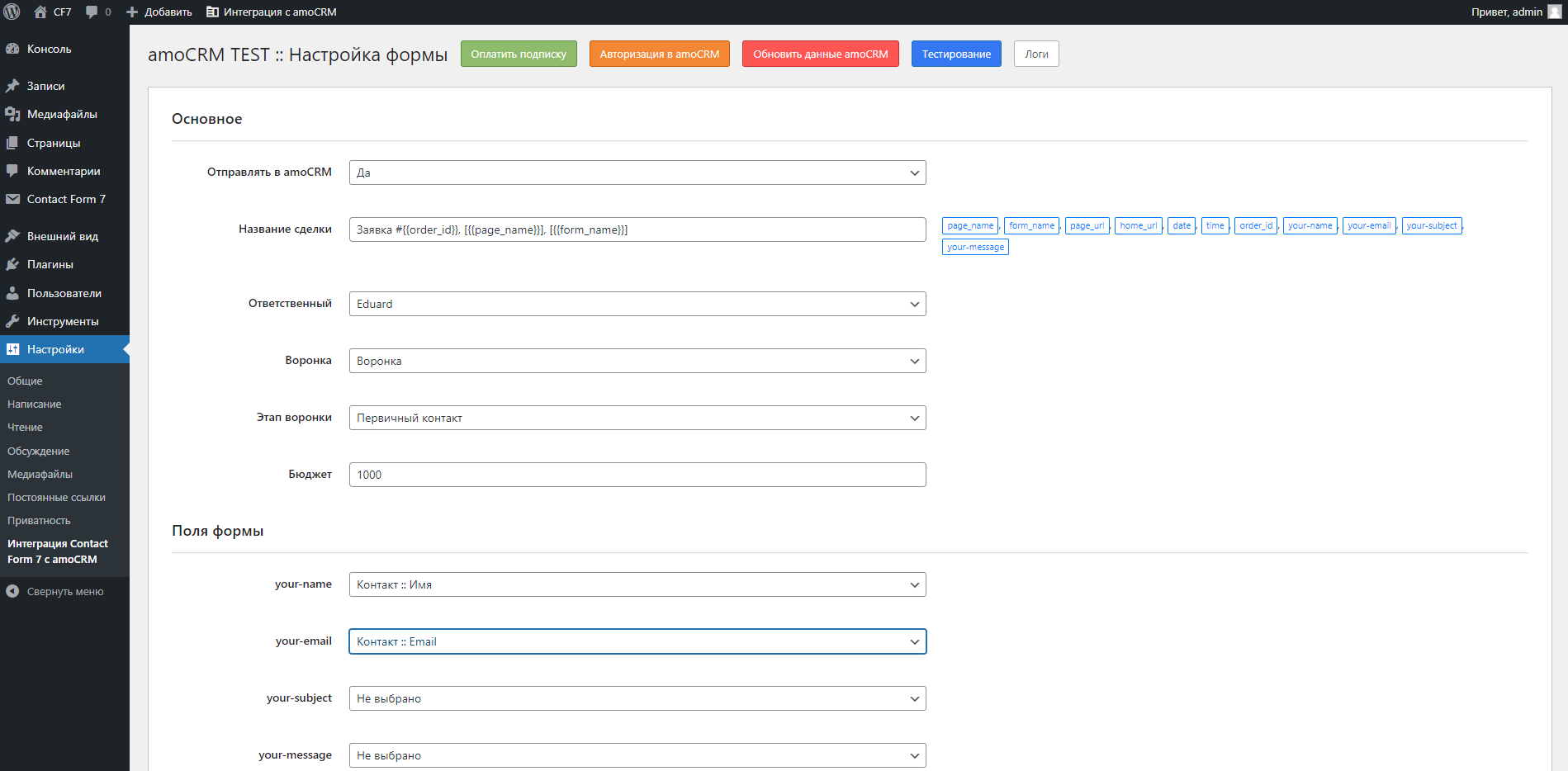 При активации плагина все доступные данные из amoCRM автоматически загрузятся, вам останется их только выбрать из списка и сохранить настройки.