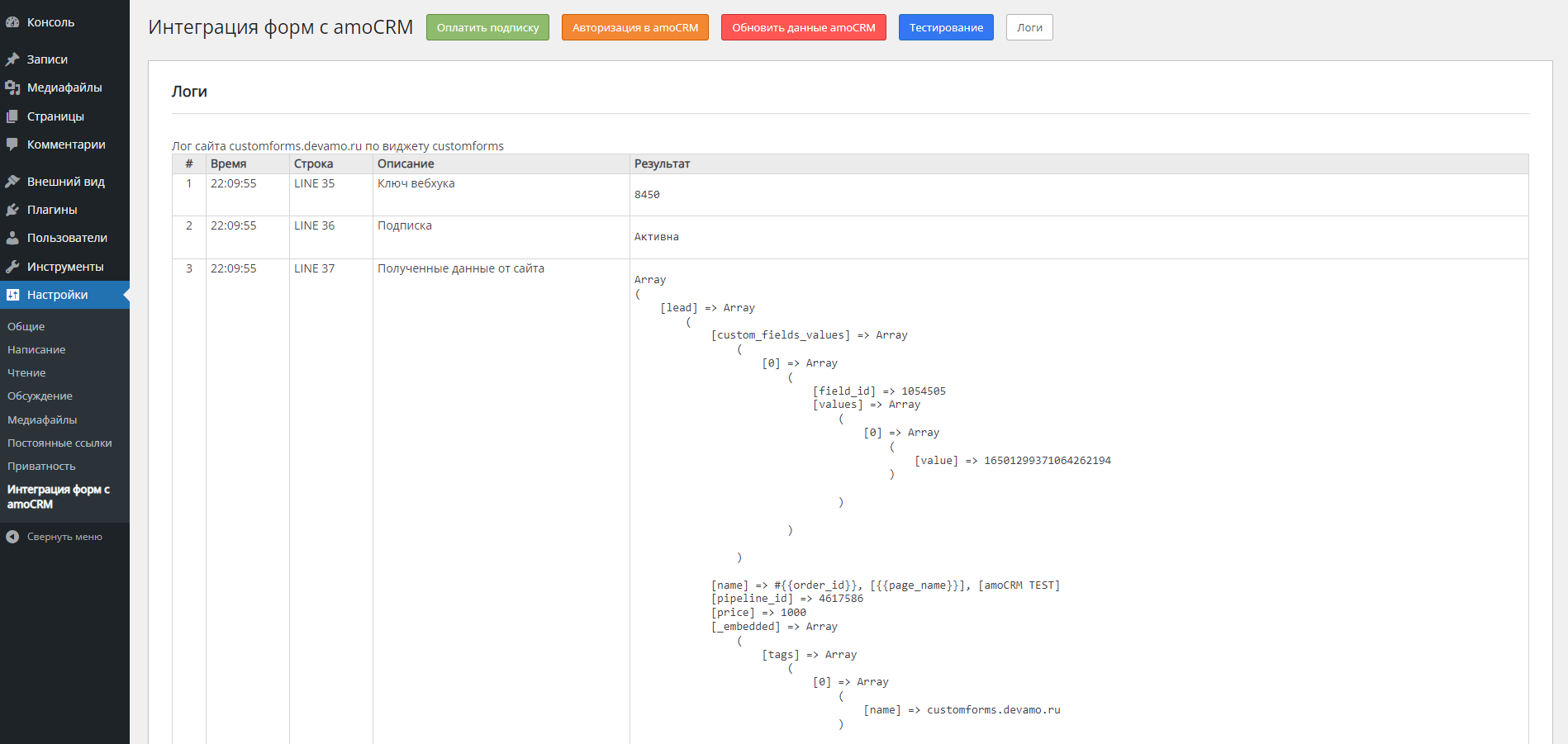 Скриншоты настроек плагина Wordpress формы для интеграции с amoCRM и переданной заявки в amoCRM