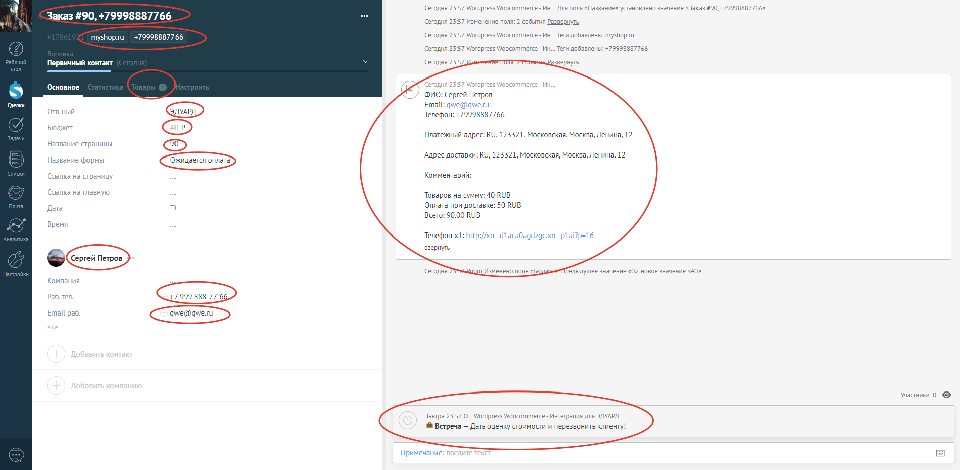 - Передавать в поля сделки или контакта любые данные из заказа.