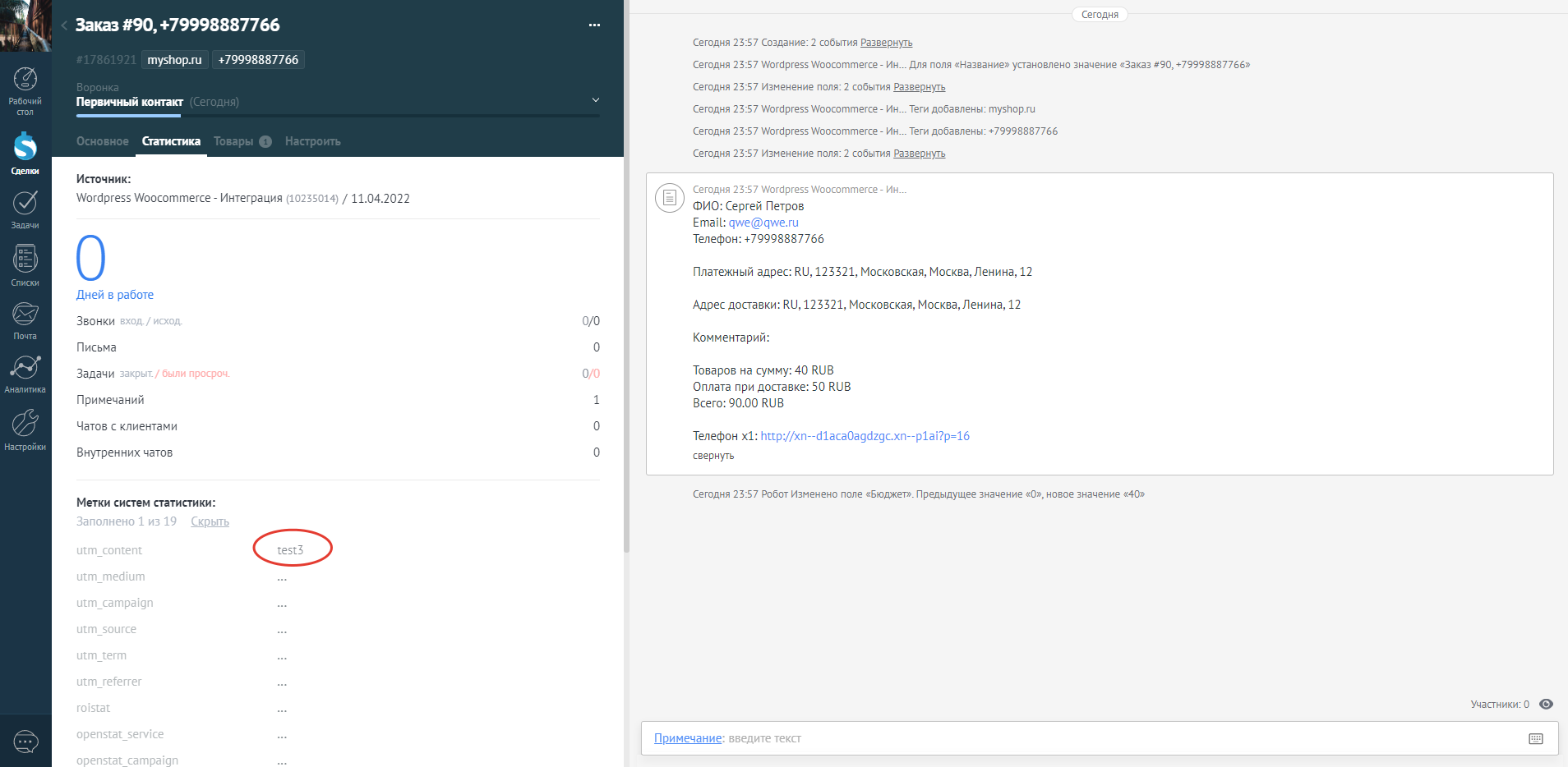 Возможность добавлять неограниченное количество тегов для сделки и UTM-меток с использованием полей заказа.