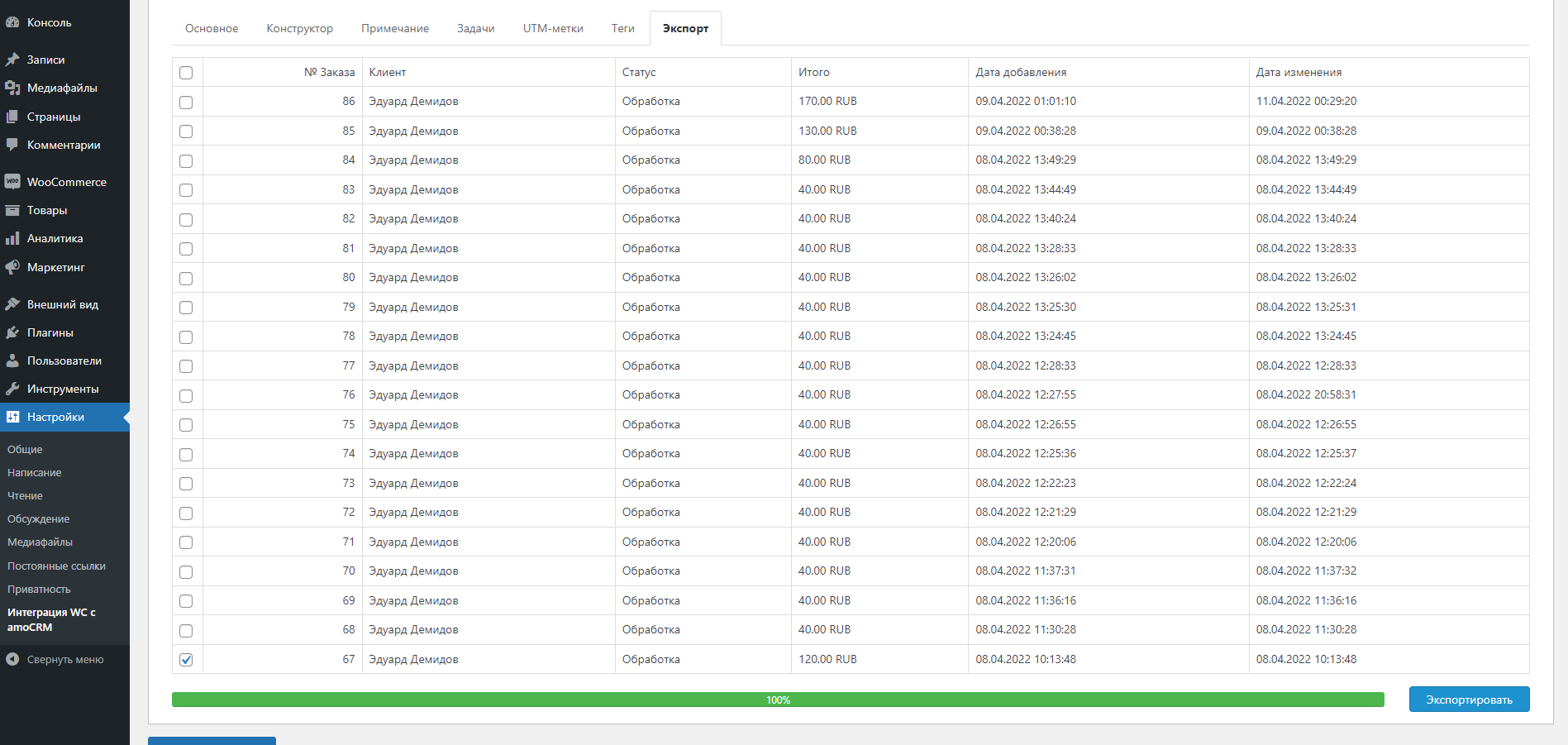 Для вашего удобства мы разработали Экспорт заказов, чтобы вы могли быстро передать всю необходимую информацию в amoCRM из Wordpress Woocommerce.