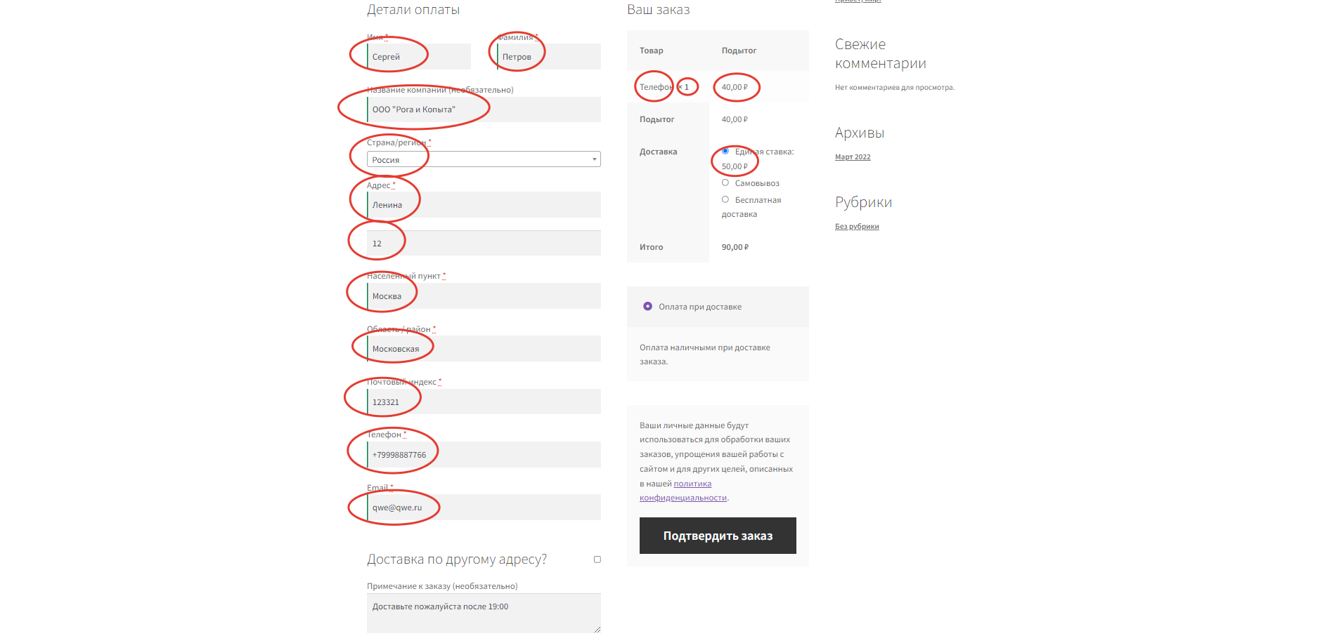 - Автоматически добавляются в примечание: сумма товаров, способ доставки, способ оплаты, итоговая стоимость.